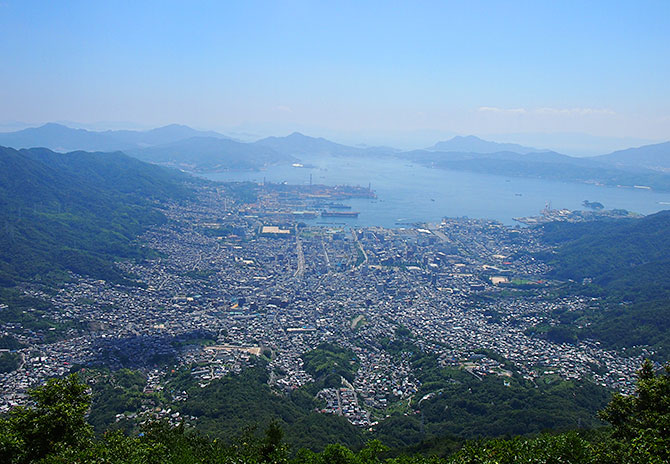 標高737m、旧海軍の高角砲台跡が展望台として整備され、360度の大パノラマが楽しめます。港町を一望する美しい夜景は、中・四国三大夜景として知られています。光の筋が「くれ」と読めるとそのカップルは結ばれるという噂もあるロマンチックスポット。