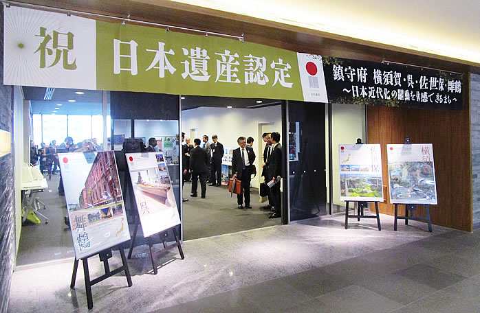 また、同サミットでは、日本遺産認定団体によるブース出展が行われ、旧軍港四市もブースを展示しました。馳浩文部科学大臣による視察をはじめ、メディア関係者、旅行業者、地方自治体関係者、一般参加者などがブースを多く訪れ、小村市長、朝長市長とともに4市の職員が参加者に対して旧軍港市の魅力のPRに努めました。