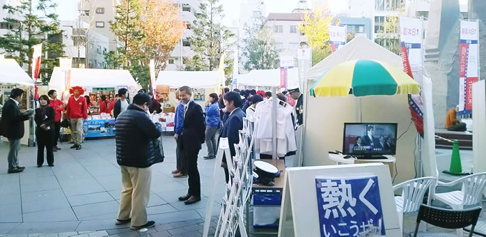 また、11日(金)と12日(土)の両日、スカイツリータウン1階のソラマチ広場にて四市観光物産博を開催。四市がそれぞれのブースを構え、各市自慢の特産品を販売すると同時に、パネル展示による四市近代化遺産の紹介を行いました。自衛隊基地を有する四市ともゆかりの深い防衛省にもご協力いただき、パネル展示による各部隊の取組み紹介、制服の着せ替えコーナーを出展いただきました。