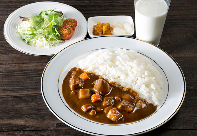 横須賀はカレーの発信の地。明治期の日本海軍レシピ「海軍割烹術参考書」をもとに当時の味を忠実に再現しました。海軍カレーは栄養バランスを考慮し、サラダと牛乳を必ず添えることが提供のルールとなっています。
