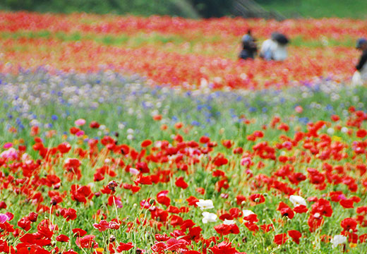 春のポピー・秋のコスモス100万本など、四季を通じてさまざまに彩られる花の楽園。ハーブ園や足湯、冒険ランドなど他にも楽しさ満載。